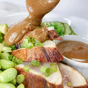 For the Poke Sauce, in a small saucepan, add peanut butter, The Original Maui Sauce / Marinade, water and chilli garlic sauce. Whisk to combine. Bring to a boil on medium high. Reduce heat and simmer, while whisking, for 3 minutes until sauce is thickened. Set aside. |