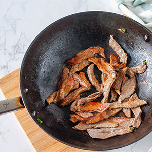 Add ½ tablespoon of oil to the same pan. Once its heated, add the sliced tenderloin in an even layer. Cook the beef for 1 to 2 minutes on each side. |