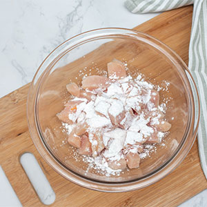 In a large bowl, season the diced chicken with salt and pepper, then toss with cornstarch. |