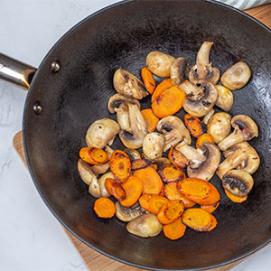 Heat oil in a large skillet or Wok over med-high heat. Add carrots and mushrooms to skillet, cooking for 5 mins until carrots soften and mushrooms release juices. Add chicken and sauté for another 5 minutes until browned, stirring often. |