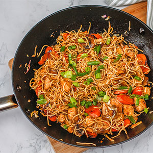 Add onion, green cabbage and chow mein noodles to the skillet, sautéing another 2-3 minutes, then add broth, The Original Maui Sauce and the sesame oil. Cook for 2-3 additional minutes until the sauce thickens. Stir in green onions and remove from heat. Serve garnished with sesame seeds (optional) and enjoy! |