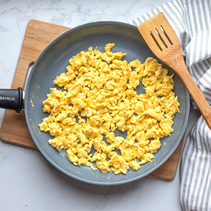 Add the butter into a large non stick skillet and heat over medium-high heat until melted. Add the eggs. Cook until the bottom is slightly set. Scramble until the eggs are mostly cooked. |