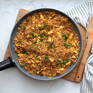 Add the rice onto the egg. Cook and mix the ingredients together. It is best to prepare the rice a few days before and keep it in the fridge to dry it out. |