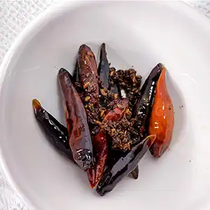 Add oil to a wok or sauté pan on medium high heat. When the pan is hot, add the dried chili peppers and crushed Szechuan peppercorns. Stir fry until fragrant, do not burn. Remove and set aside. |