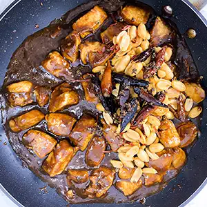 Add the sauce to the pan and continue cooking until the sauce is thickened and coats the chicken. Return the fried chili peppers, Szechuan peppercorns to the pan. Add the roasted peanuts and stir to combine. Remove from stove and serve hot with rice and steamed vegetables. Enjoy! |
