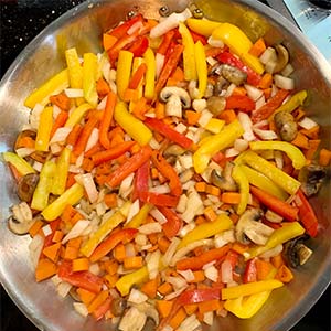 Add onion, green pepper and red pepper to the skillet, sautéing another 6 minutes. |